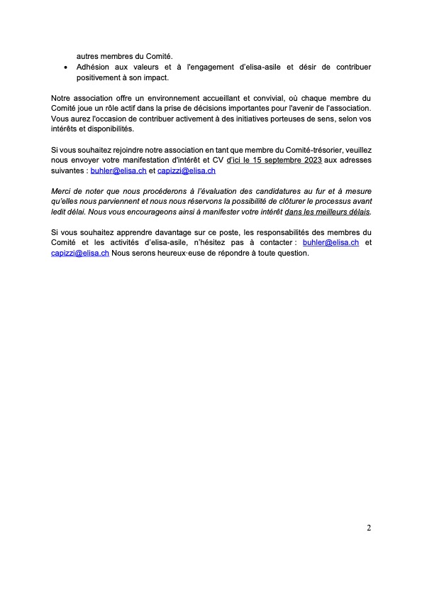 Si vous souhaitez apprendre davantage sur ce poste, les responsabilités des membres du Comité et les activités d’elisa-asile, n’hésitez pas à contacter : buhler@elisa.ch et capizzi@elisa.ch Nous serons heureux·euse de répondre à toute question.