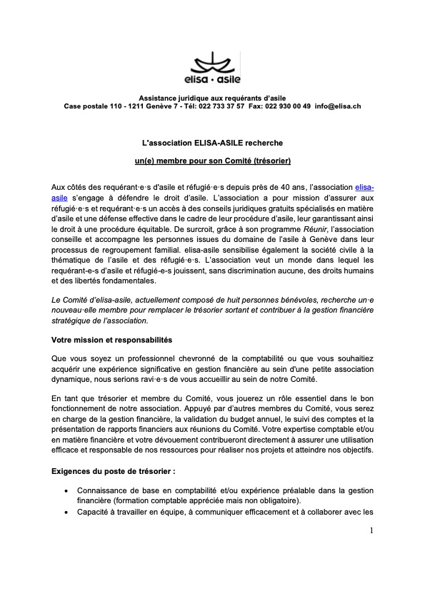 Le Comité d’elisa-asile, actuellement composé de huit personnes bénévoles, recherche un·e nouveau·elle membre pour remplacer le trésorier sortant et contribuer à la gestion financière stratégique de l’association.